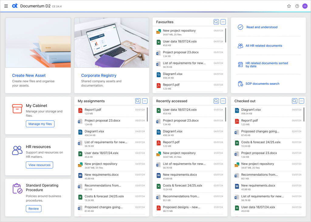 Documentum D2 is one of the biggest selling products in the OT family. The dashboard is mainly operation-focused, with many links to content and views of recent documents / documents being worked on by a user. It is important that all the relevant information is at their finger tips.