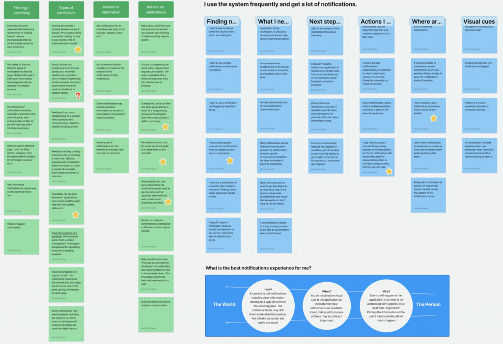 I find affinity diagrams help codefy user feedback, identify patterns, and an opportunity to understand their point of view and predict their behaviours. In this instance ‘filtering’, ‘types of content’, ’actions to be taken’ are key themes that appeared and those were developed into mental models and more specific use cases.