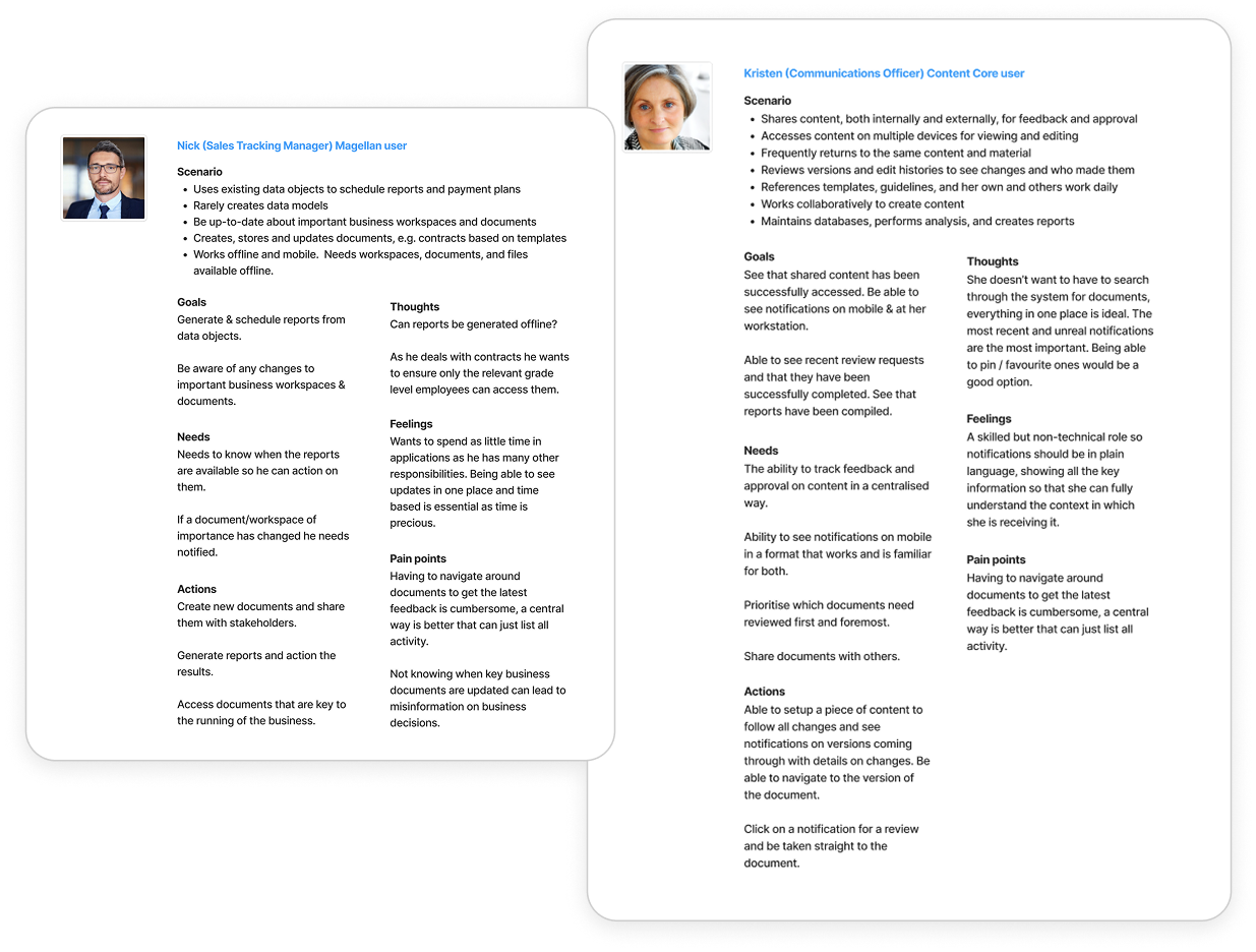 I took selection of personas created for the biggest selling applications, to understand what are the key objectives for the roles within those systems and what types of notifications /  will help supplement their daily work.